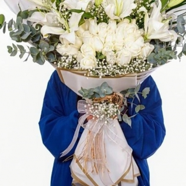 Ürün Kodu: Af2129 Adet Beyaz Gül 5 Dal Lilyum ve Yeşillikler ile Hazırlanmıştır.