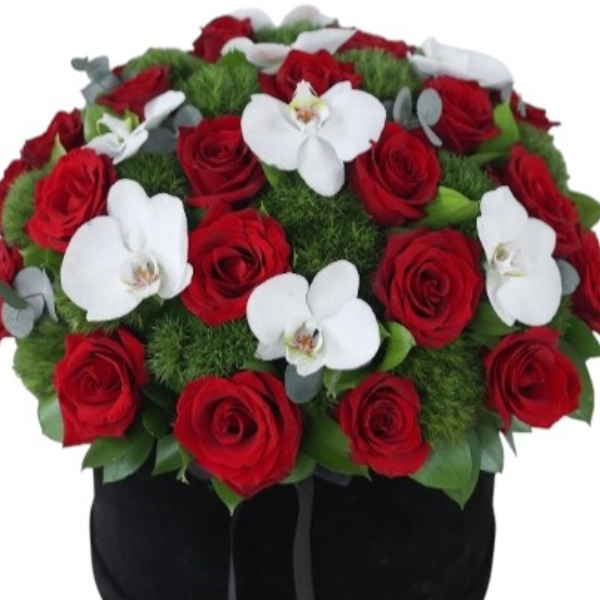 Siyah Kutuda 21 Adet Kırmızı Gül ve Orkide Aranjmanı
